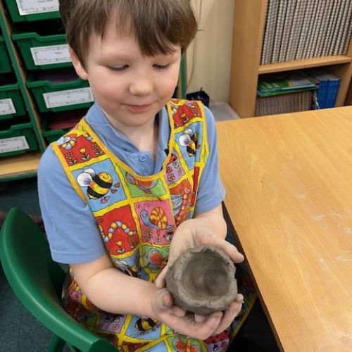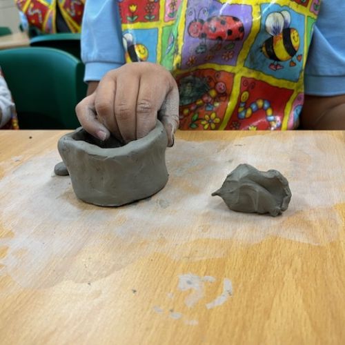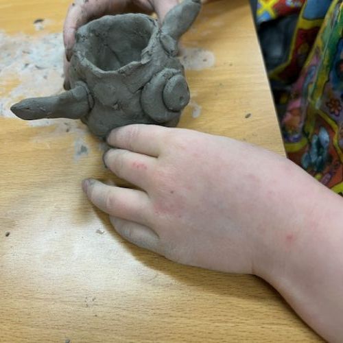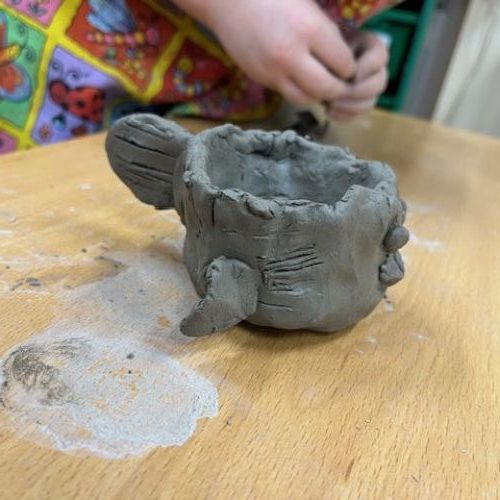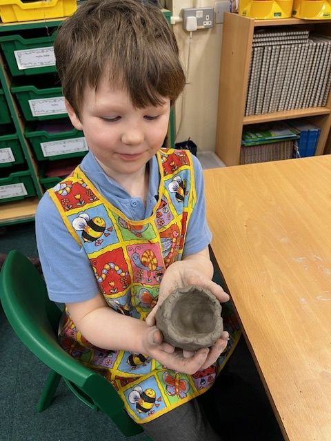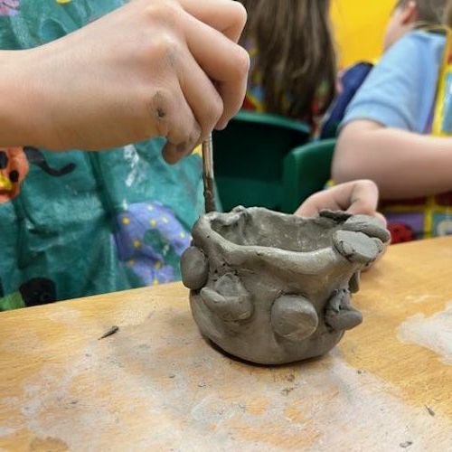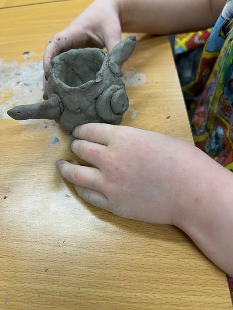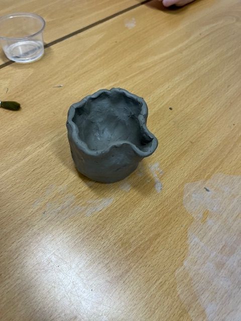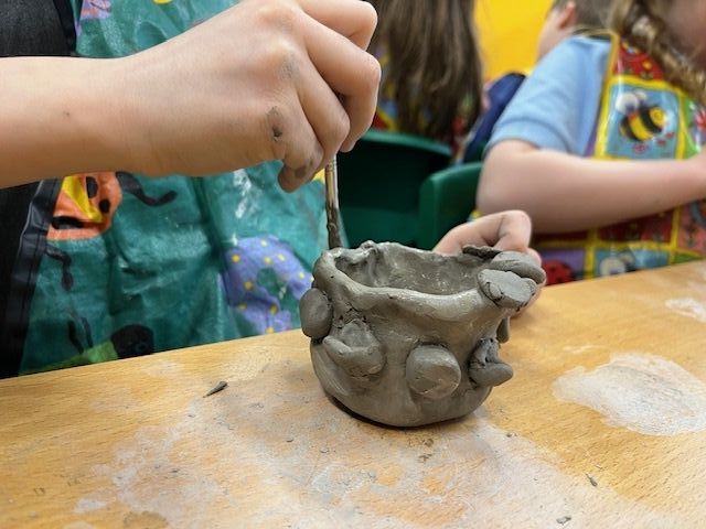 We've been learning how to make a pinch pot out of clay. We scored and used slip to add decortation.
